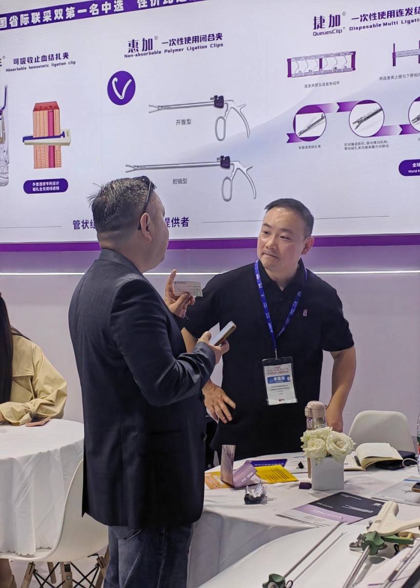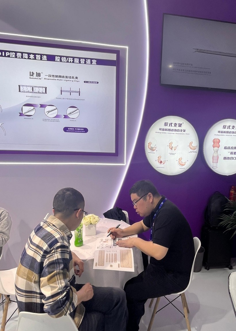 圣石同期展示的獨產品又一次聚焦了眾人目光。全球首創捷加?一次性使用連發結扎夾及配套捷施?連發施夾鉗,其獨特的可重復使用連發鉗專利設計,以及“2-6枚連發夾靈活選裝”專利技術不僅降低耗材使用成本,更通過流暢的操控性適配腔鏡復雜場景需求。圣石浙大邵逸夫醫院聯合研制,可應用于腸道吻合與轉流創新產品蔡式支架?可崩解腸道吻合器”使此項全球創新術式配套產品具有吻合時間短、無永久殘留異物、不破壞吻合口粘膜下血管,并能預防吻合口漏、可避免人工肛門及二次手術、治療周期縮短、減少患者生理心理創傷等多項臨床優勢
